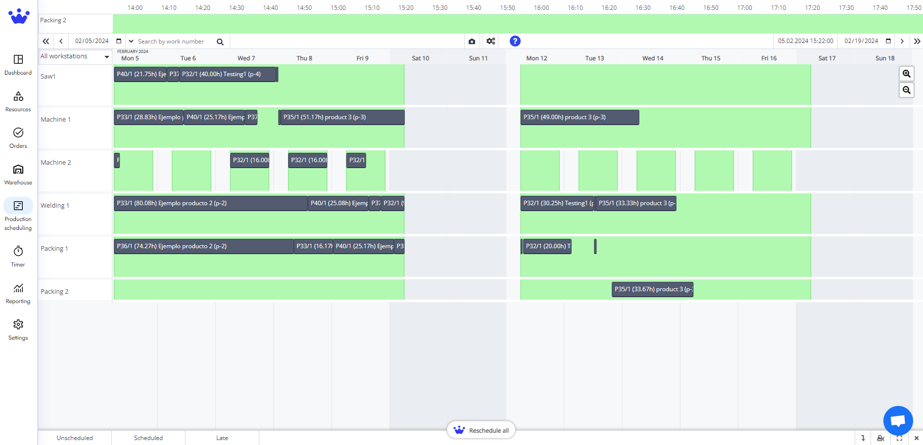 Finally, the Late tab contains jobs starting after the planned end time because of insufficient material amount, late purchase arrivals, or other factors.