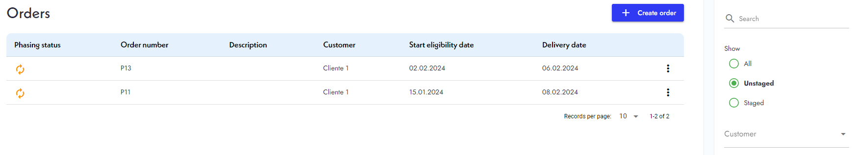 - You can filter your order by name, status, customer, eligibility, and delivery date.