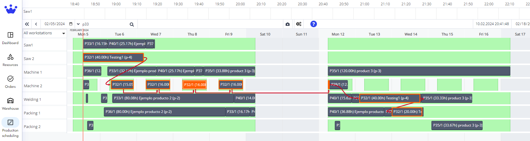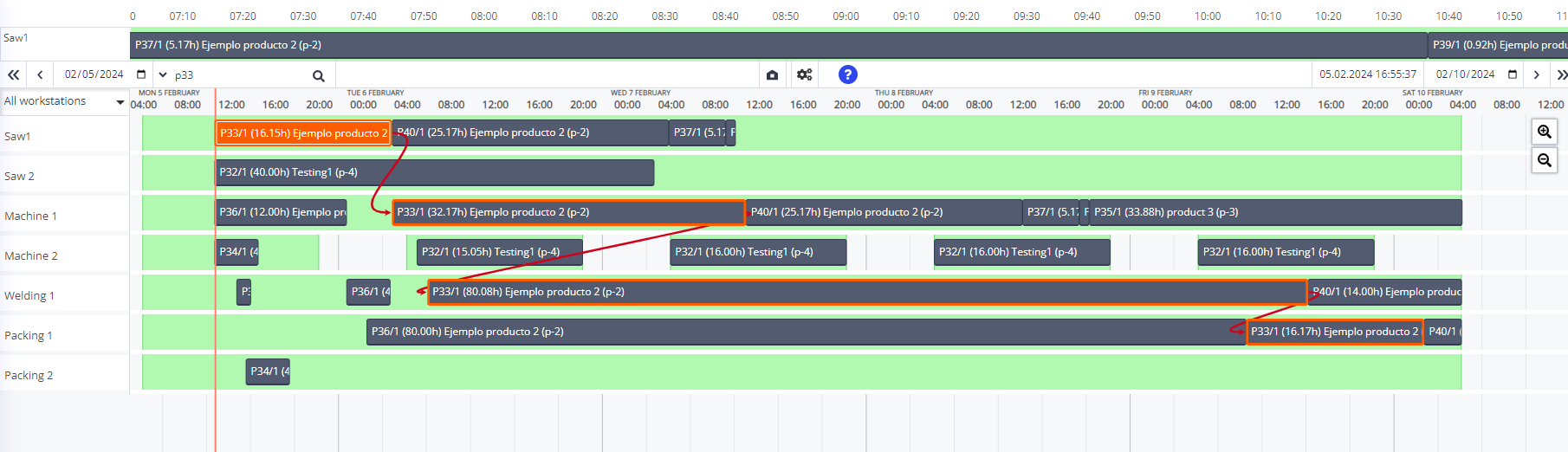 On the GANTT Timeline, seeing a job's flow process is straightforward. Just click on the job. You will notice the arrows that indicate all the process steps that need to be done and at what time.